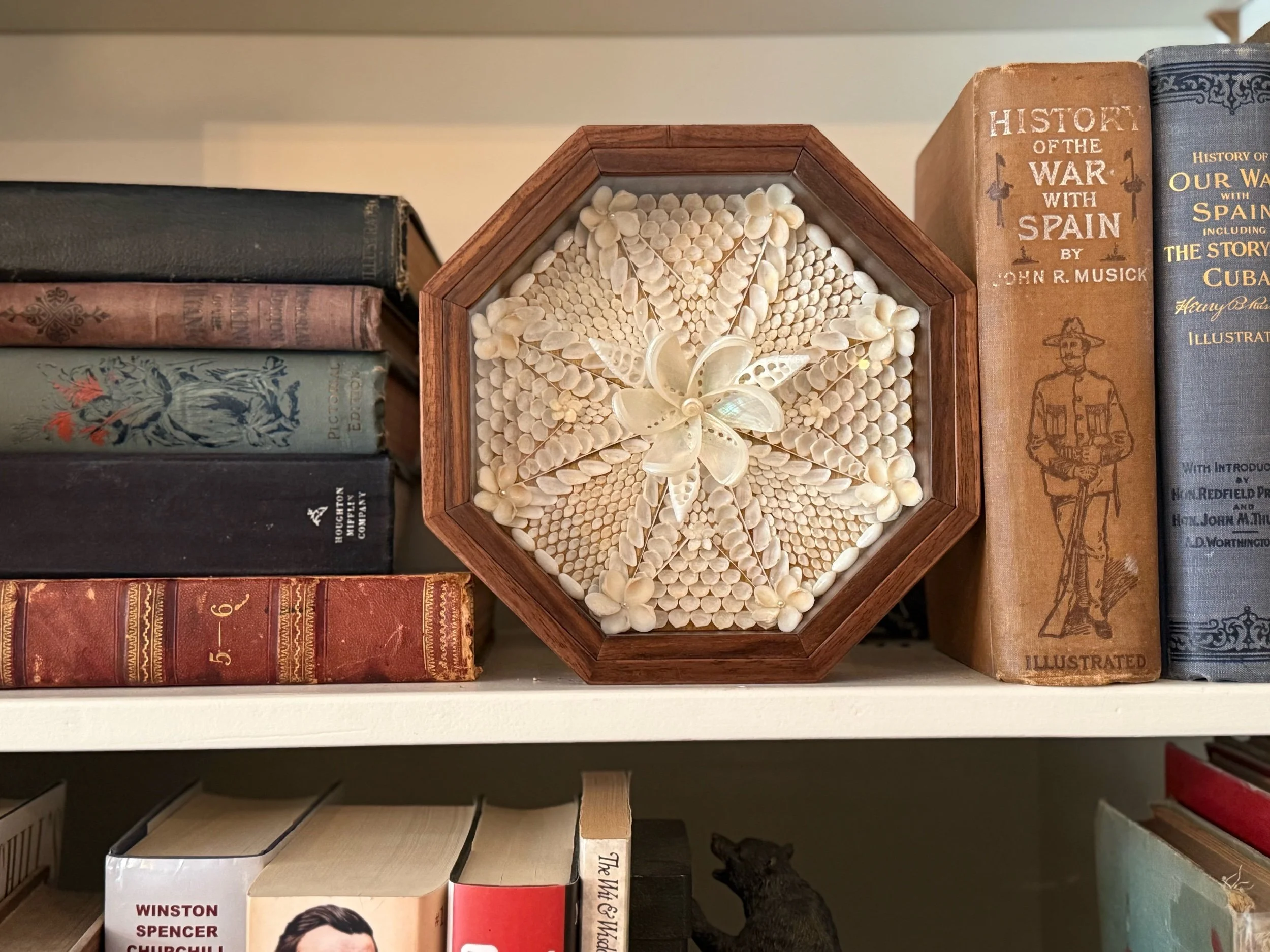 An elegant tribute to 19th-century maritime craft, this Sailor’s Valentine is meticulously composed from hand-selected natural shells in a soft ivory palette. Set within a warm octagonal mahogany frame, the design radiates outward in precise symmetry, culminating in a luminous central blossom formed from iridescent shells.